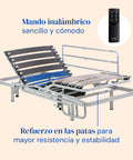 • Cama articulada: Somier eléctrico con estructura de acero reforzado y lamas anchas de madera para un apoyo seguro. Se regula fácilmente con mando por cable, permitiendo articular respaldo y piernas con total comodidad. Compatible con accesorios opcionales.