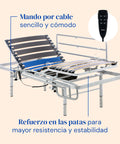 • Cama articulada: Somier eléctrico con estructura de acero reforzado y lamas anchas de madera para un apoyo seguro. Se regula fácilmente con mando por cable, permitiendo articular respaldo y piernas con total comodidad. Compatible con accesorios opcionales.