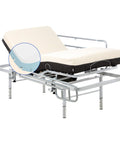 Notre lit est conçu pour votre sécurité et votre confort, étant compatible avec des barrières latérales rabattables et sécurisées. Il est également adapté à l'utilisation avec poteau porte-perfusion et lève-personne, offrant une grande polyvalence.